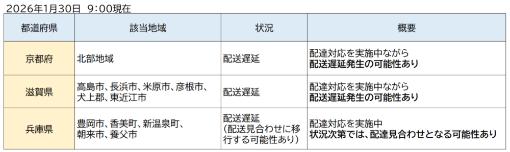 一部地域では下記の通り配達見合わせやお荷物のお届けに遅れが発生しております。