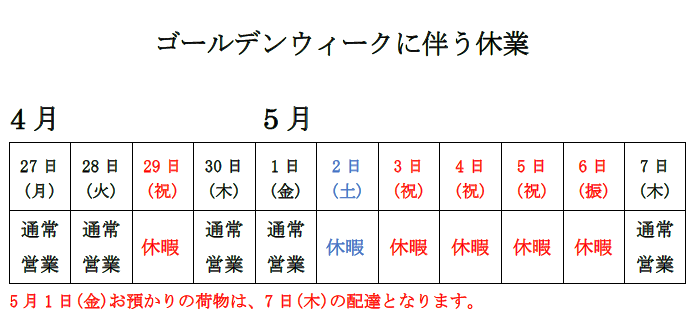 ゴールデンウィーク期間中の対応につきましては以下の通りとさせて頂きますので、よろしくお願い申し上げます。